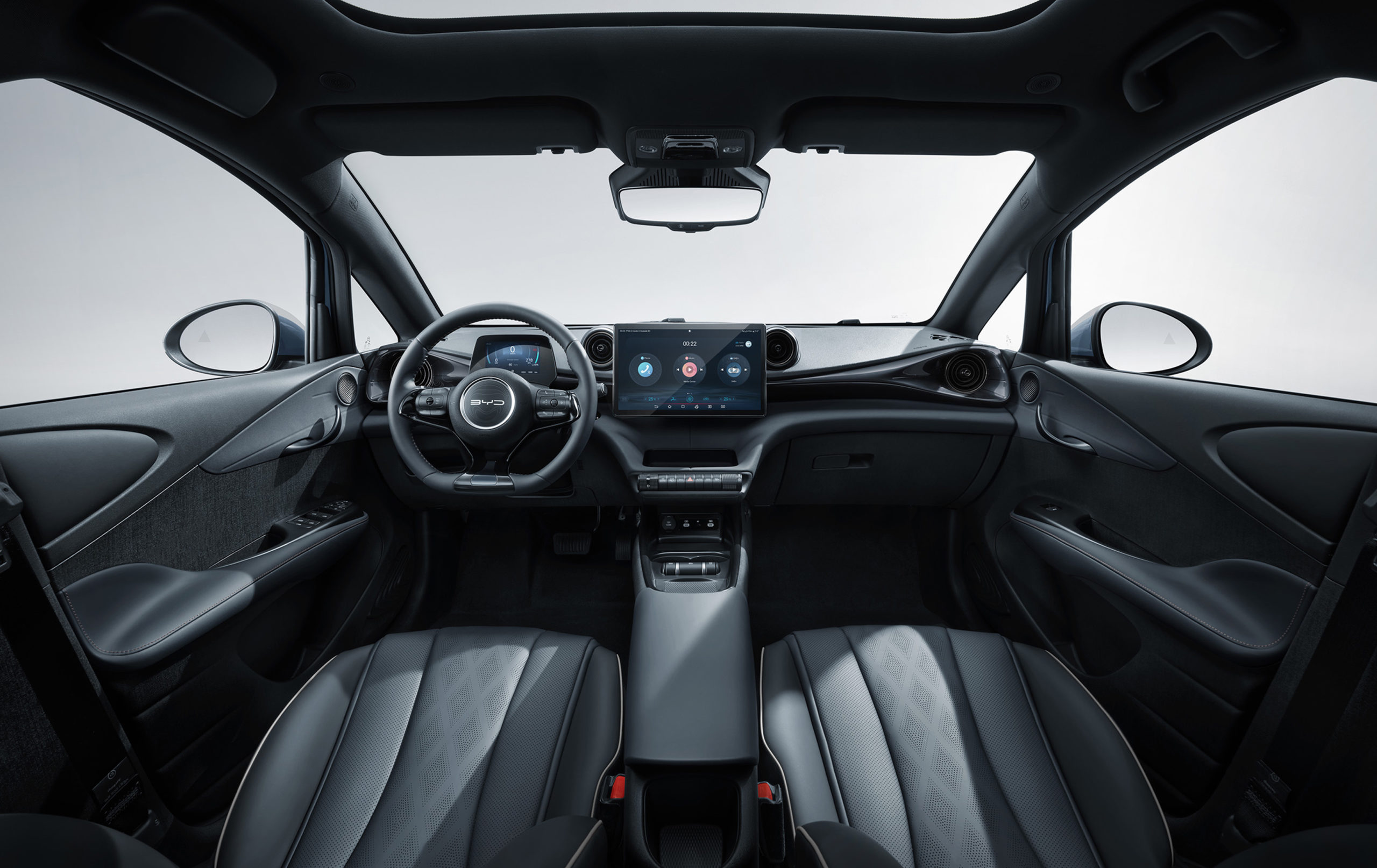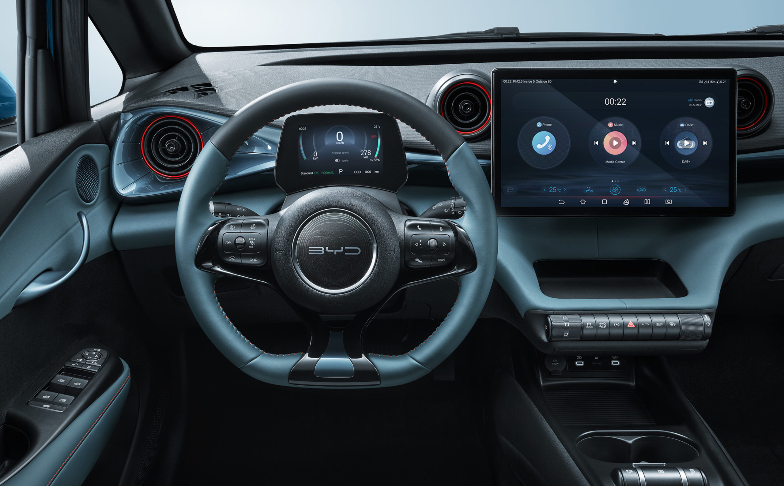 BYD Dolphin charakteryzuje się futurystycznym wyglądem nie tylko z zewnątrz, ale również w środku znajdziemy dynamiczne środowisko jazdy, z metalowymi elementami wykończeniowymi biegnącymi przez całą deskę rozdzielczą, tworząc minimalistyczną, zakrzywioną powierzchnię. Tutaj nic nie dzieje się przypadkowo.